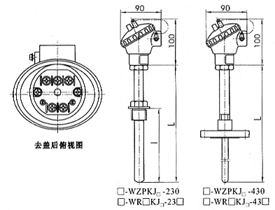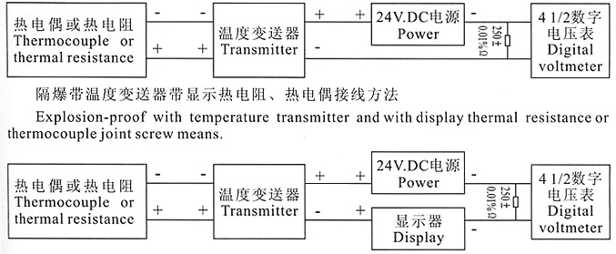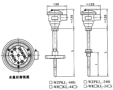 (4)型號 本安型熱電阻或熱電偶溫度變送器 □-WZPKJ□-□40i □-WR□KJ□-□4□i  一體化熱電阻、熱電偶溫度變送器 □-WZPKJ□-□30 □-WR□KJ□-□3□  為增強功能,任何熱電阻或熱電偶均可加裝溫度變送器。 |